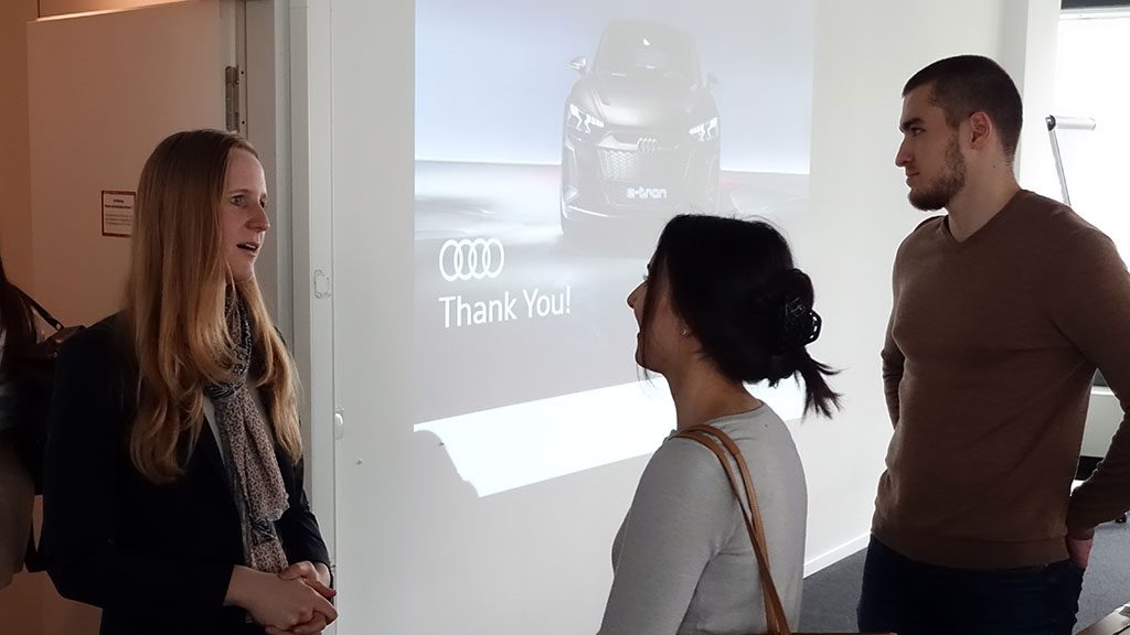 Following, they shed light on how a typical working day looks like for them, presented the tools and elements they use to optimize product costs, and added some more detailed information on what product controlling is all about. At the end of their impressive presentation, they also offered information on internship and thesis opportunities at AUDI.